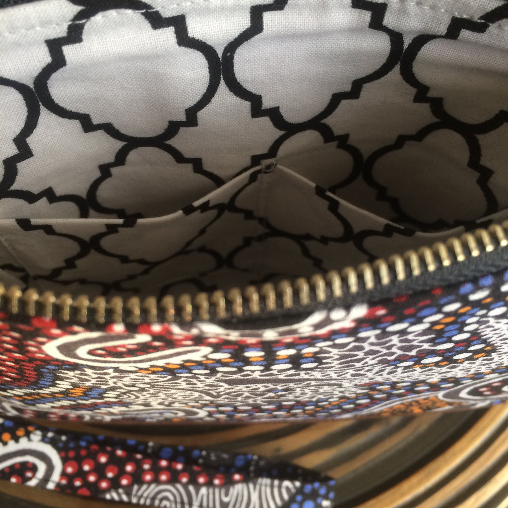 - A striking cotton design “Goanna Dreaming” by Aboriginal artist Heather Kennedy. This clutch has a brown vinyl base and is fully lined with cotton. It had 2 small pockets on the inside to store your credit cards or licence.